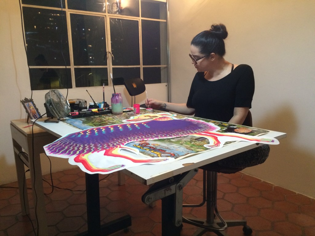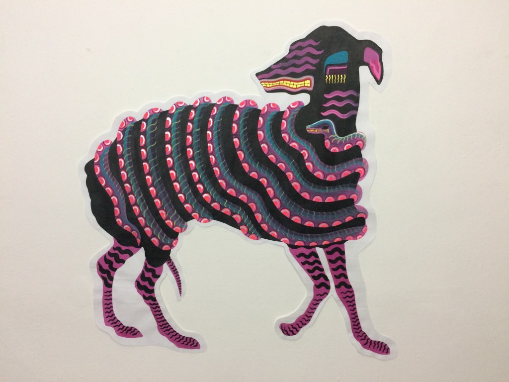 Andreina trabajó desde su práctica habitual. Toma de los animales elementos para reinterpretarlos: “hacerlos a mi manera”,comenta andreina; centrada en lo gráfico, trabaja para ampliar desde la pintura el desarrollo de una fauna salvaje y colorida.Utilizó soportes no convencionales como chaquetas y franelas. Ella expresa: “mi trabajo lo hago desde la intuición, un color llama al otro…”
